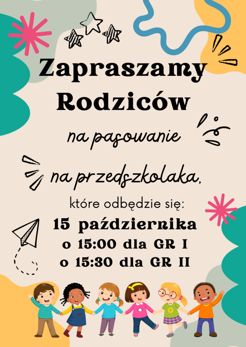 Serdecznie zapraszamy rodziców dzieci z grupy I i II na uroczystość pasowania na przedszkolaka, która odbędzie się 15 października o godz. 15:00 dla grupy I i 15:30 dla grupy II