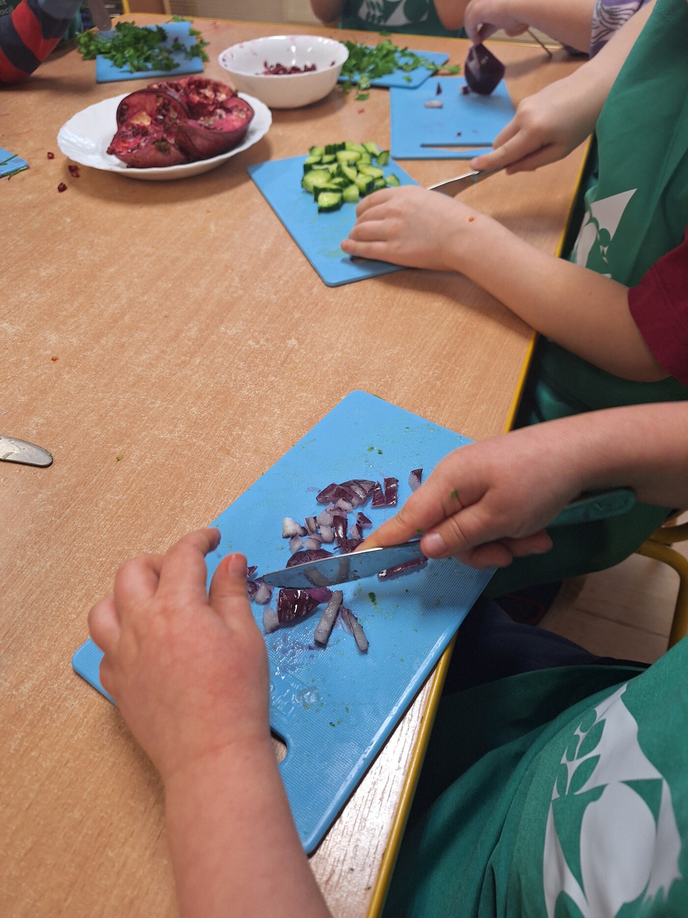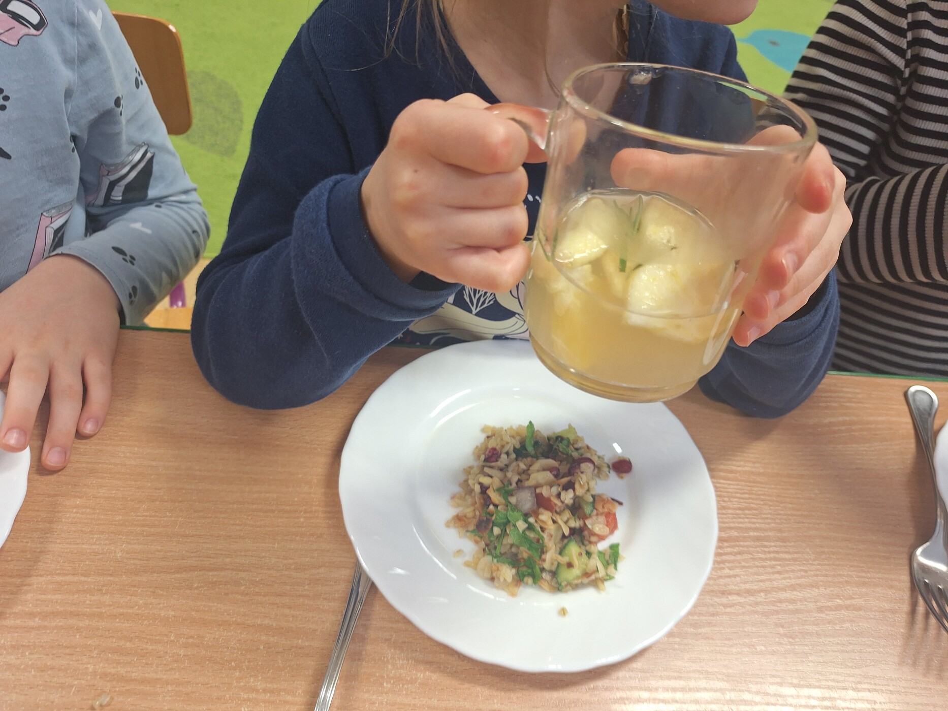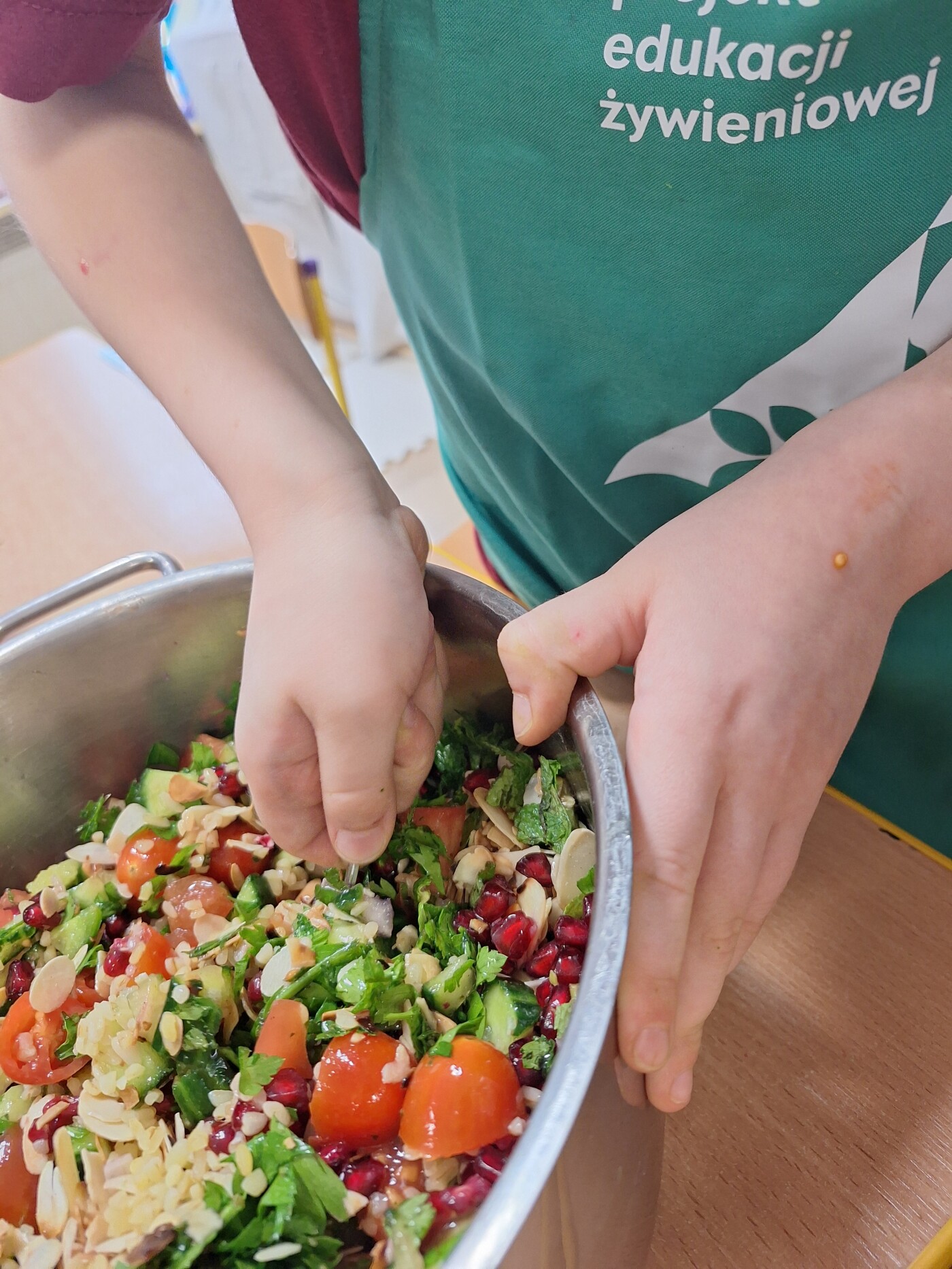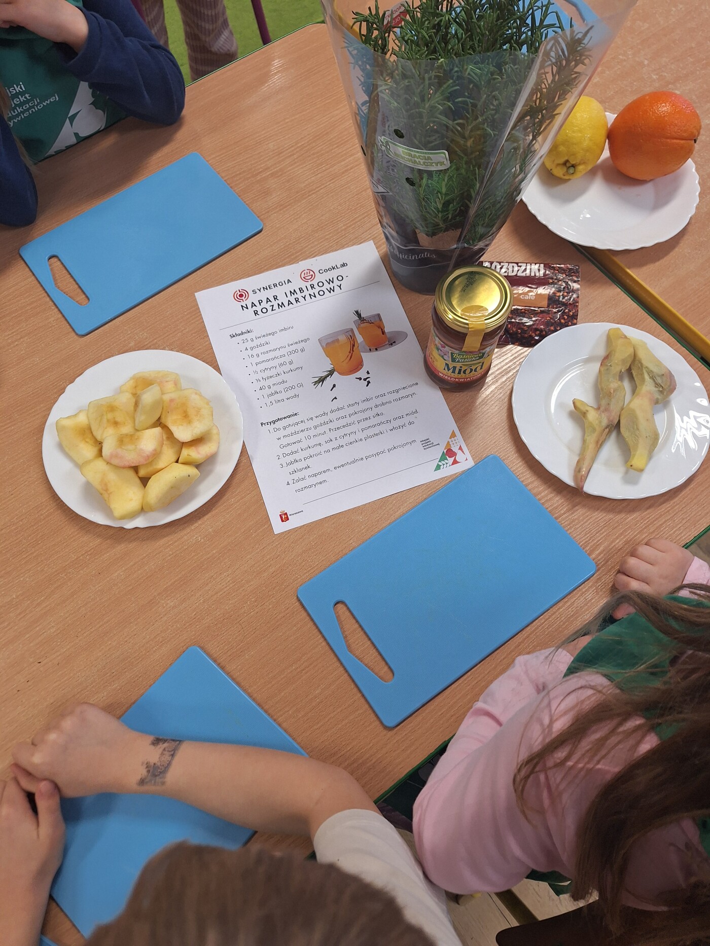 Podczas warsztatów przedszkolaki rozwijały swoje zmysły oraz próbowały poznawać nowe smaki. W części praktycznej dzieci samodzielnie przygotowały napar imbirowo- rozmarynowy oraz tabbouleh z granatem i prażonymi migdałami.