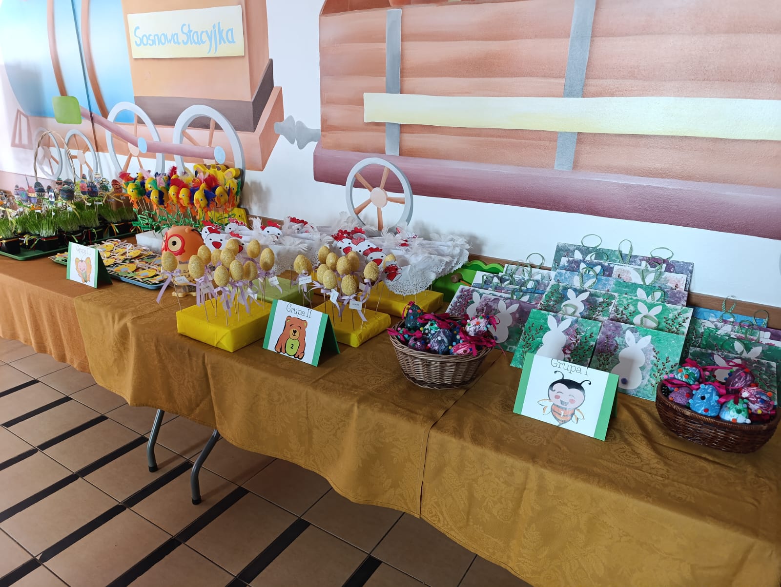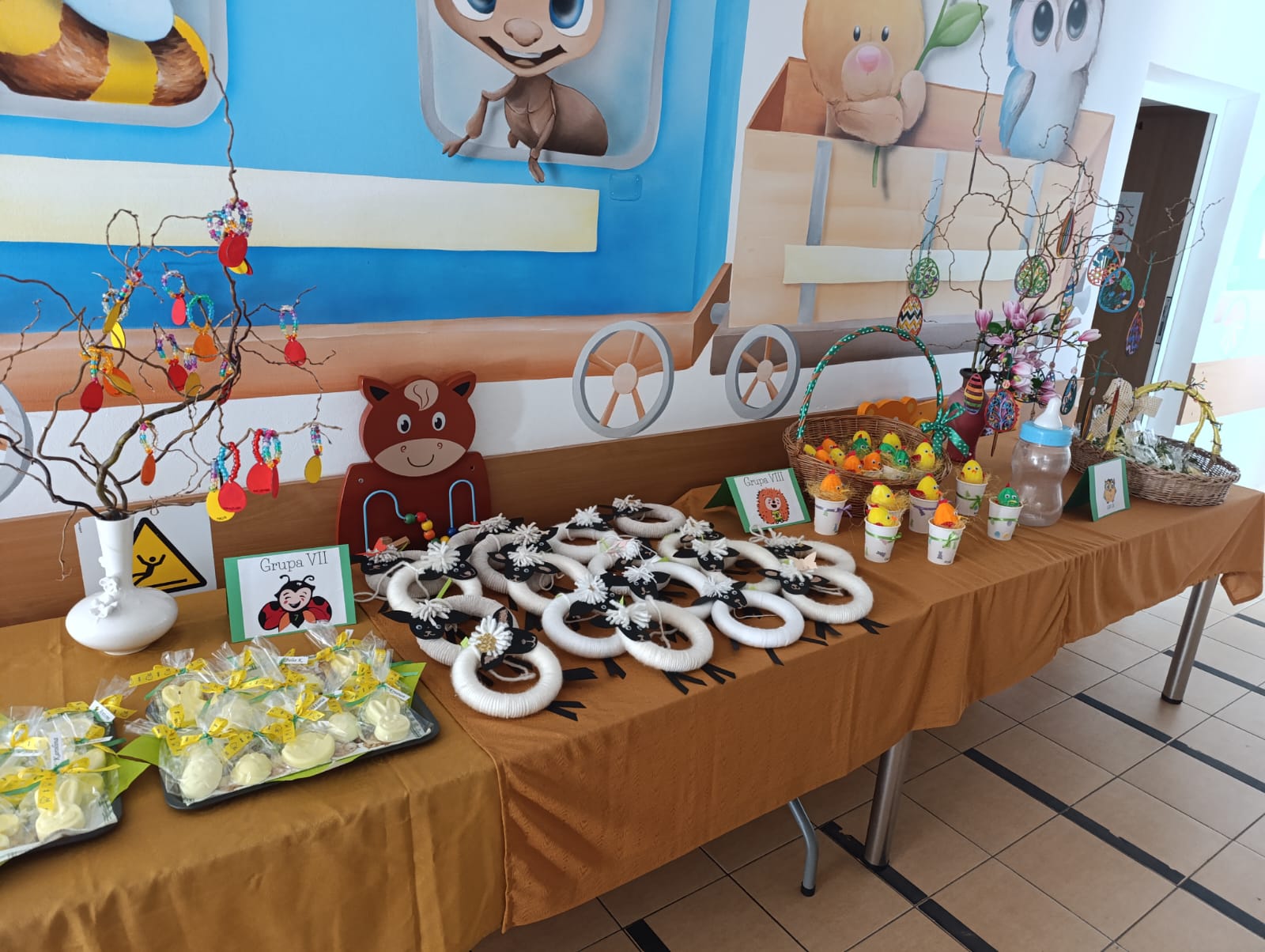 Dzień Świąteczny poprzedzony był Kiermaszem Wielkanocnym, na który Przedszkolaki przygotowały przepiękne dekoracje świateczne.
