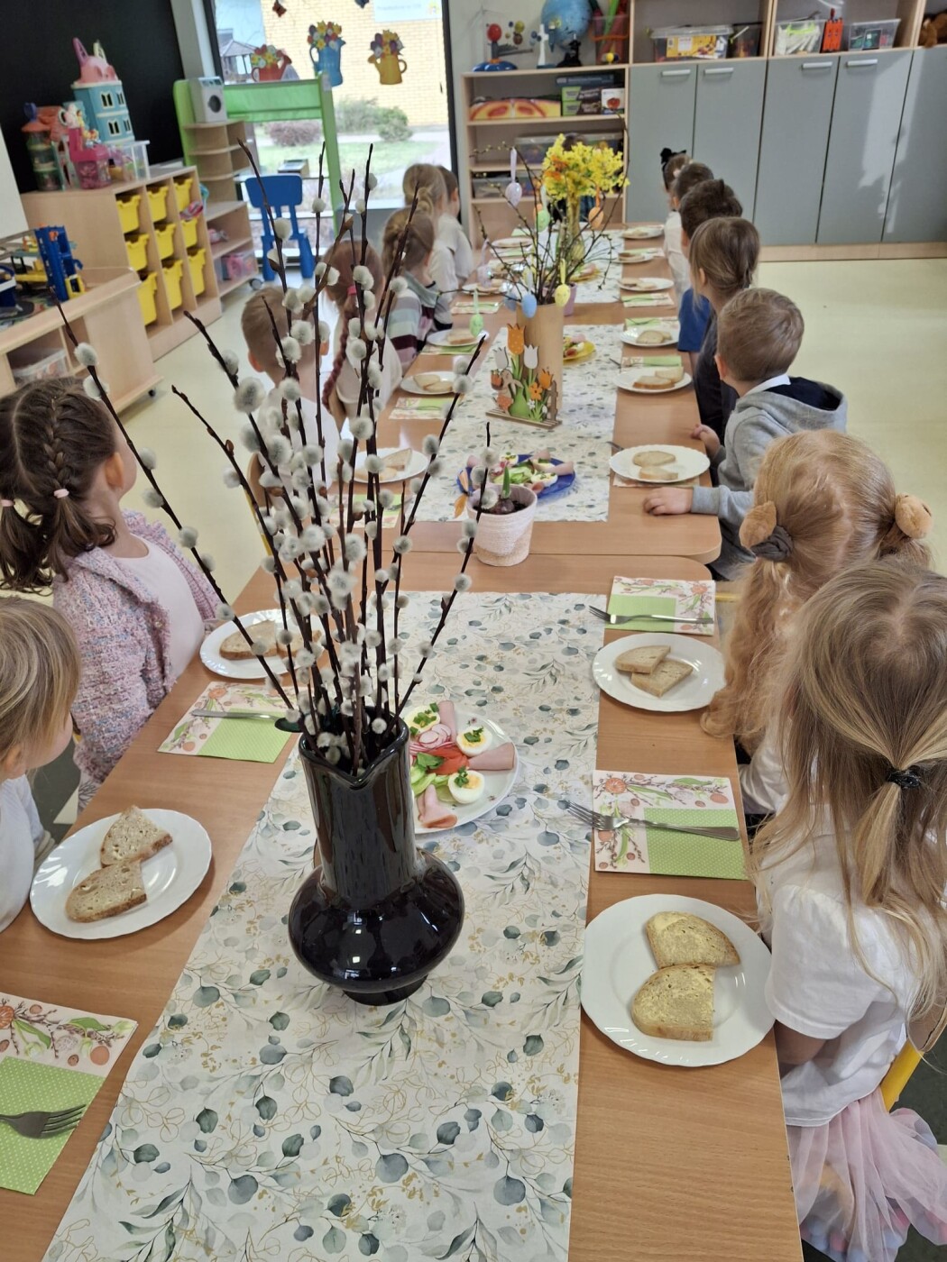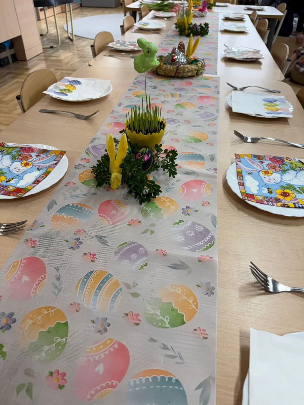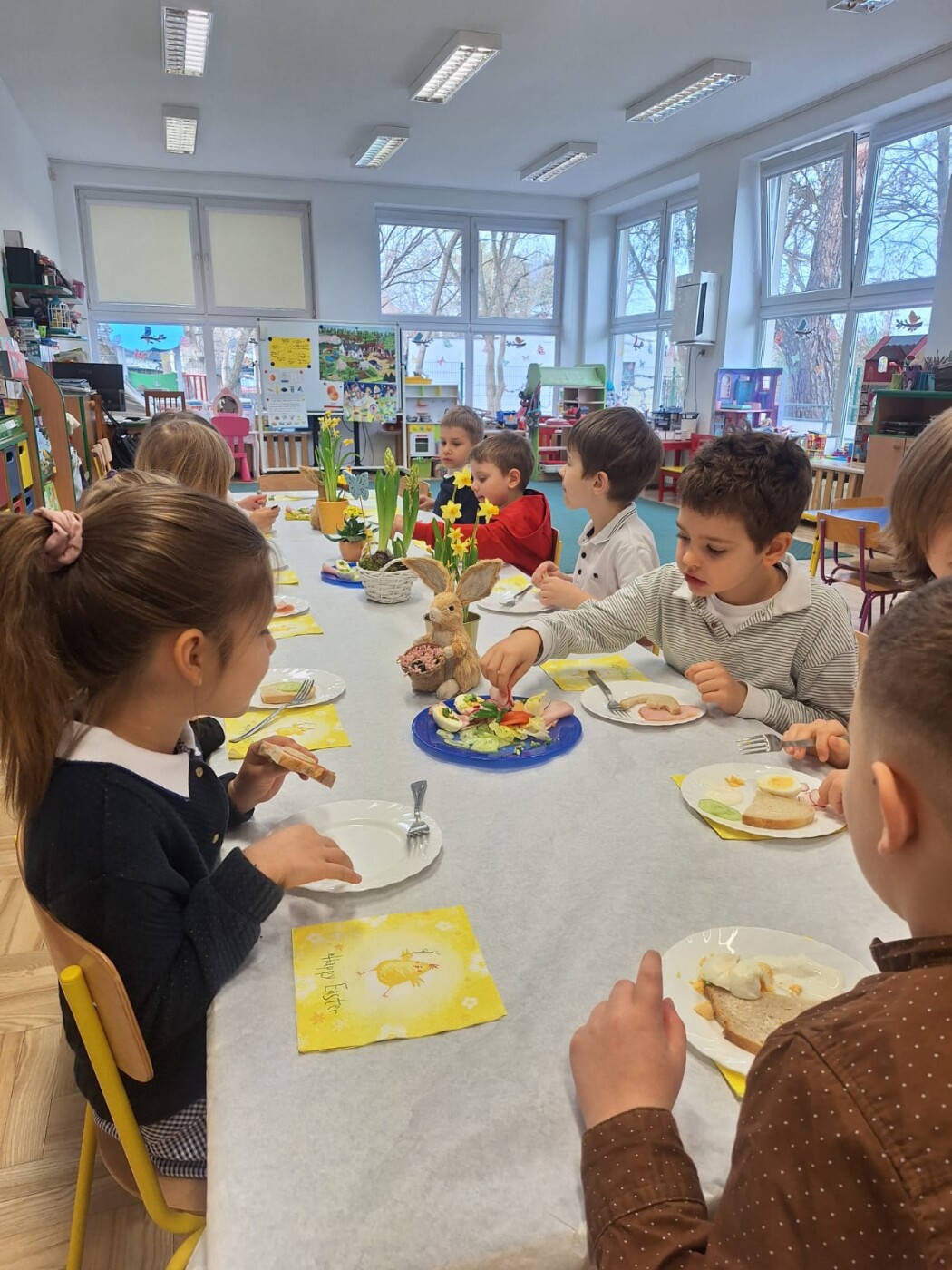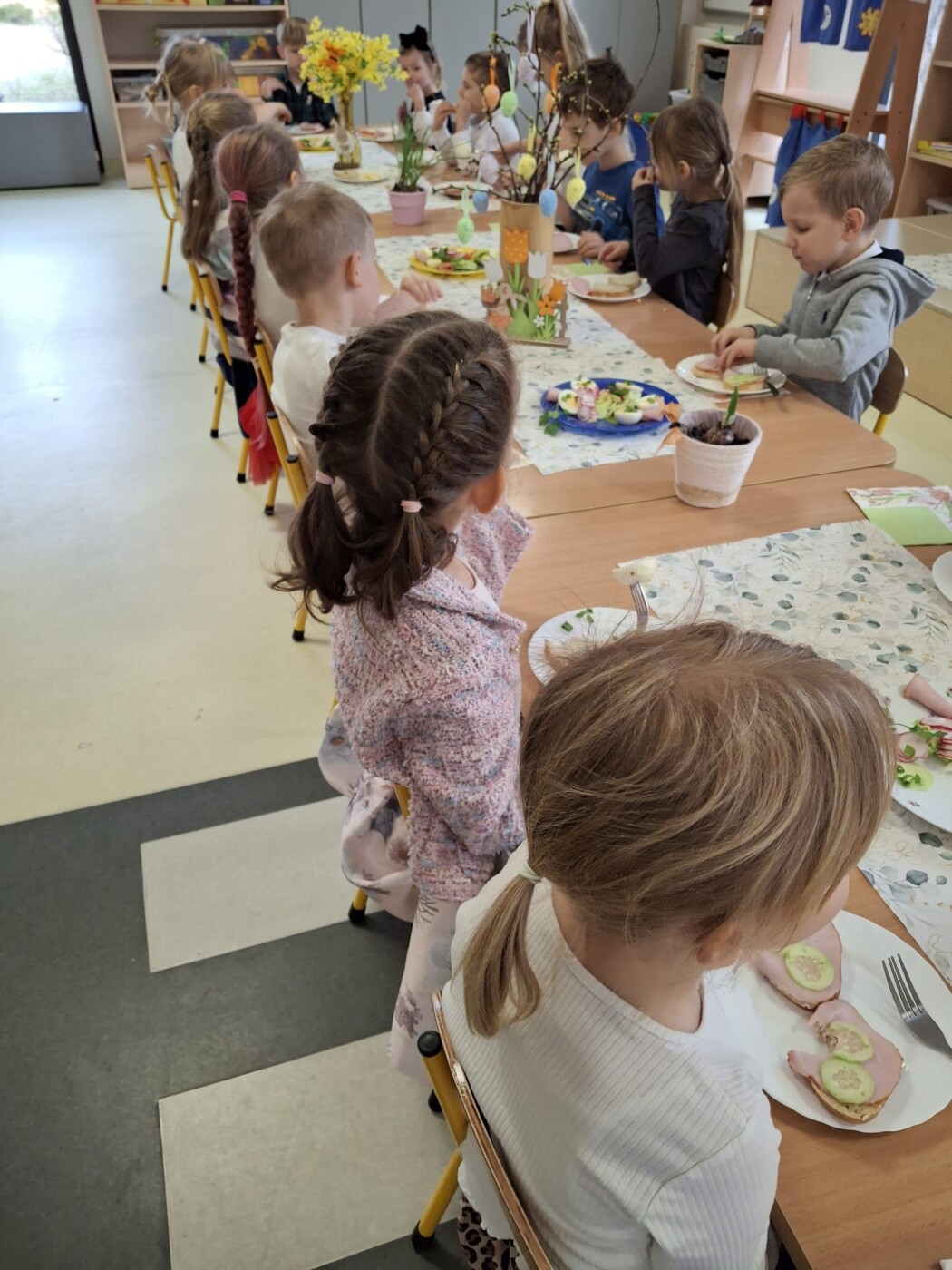 W naszym przedszkolu odbył się, jak co roku, Wielkanocny Dzień Świąteczny. Tego dnia dzieci miały okazję poznać zwyczaje związane ze Świętami Wielkanocnymi. Przedszkolaki z ogromnym zaangażowaniem uczestniczyły w nakrywaniu do stołu, poznawały tradycyjne potrawy wielkanocne. Nie zabrakło świątecznej atmosfery, uśmiechu i wspólnego świętowania. To był dzień pełen ciepła, który pozwolił dzieciom nie tylko dobrze się bawić, ale także lepiej zrozumieć piękne tradycje wielkanocne.