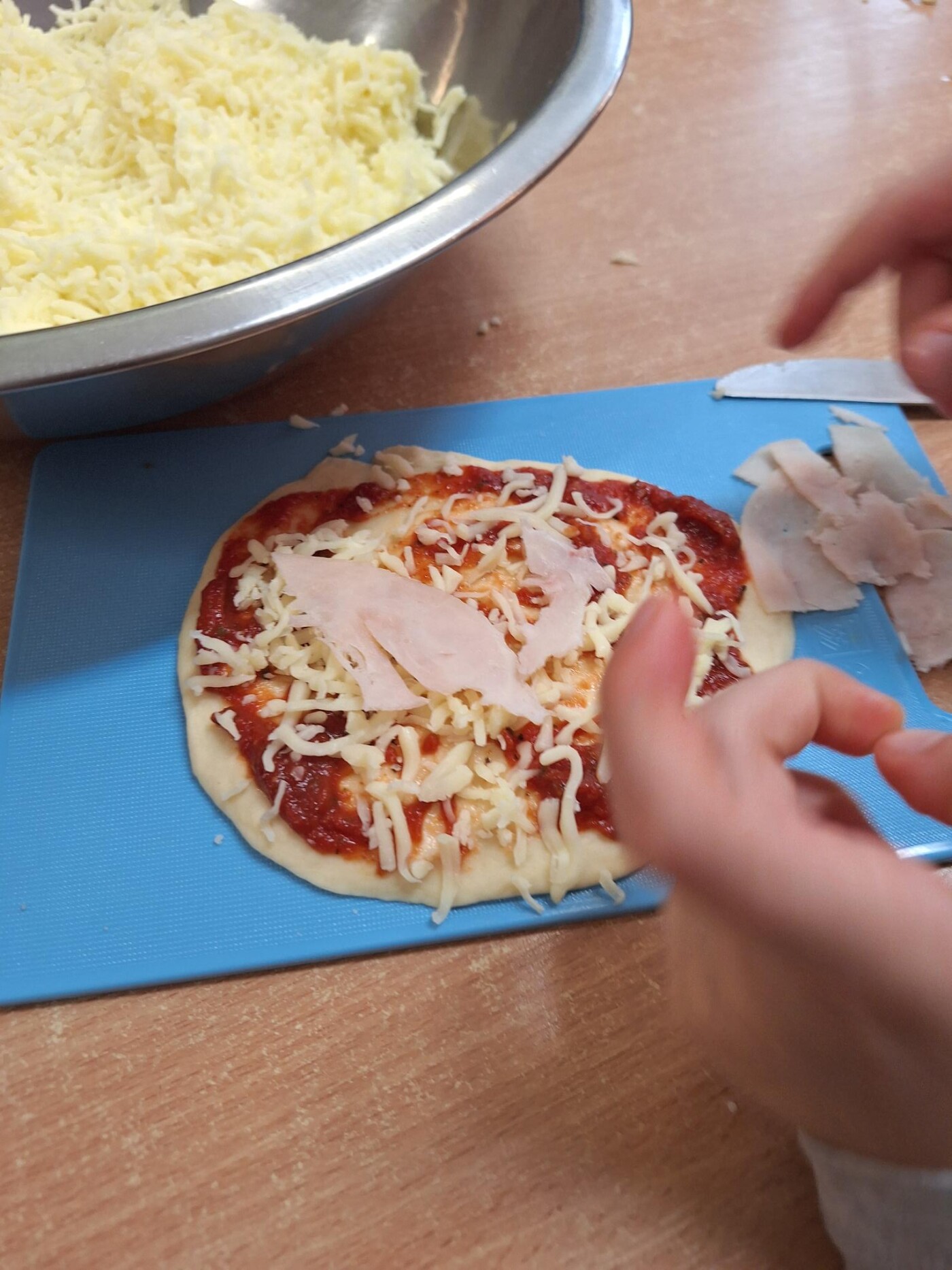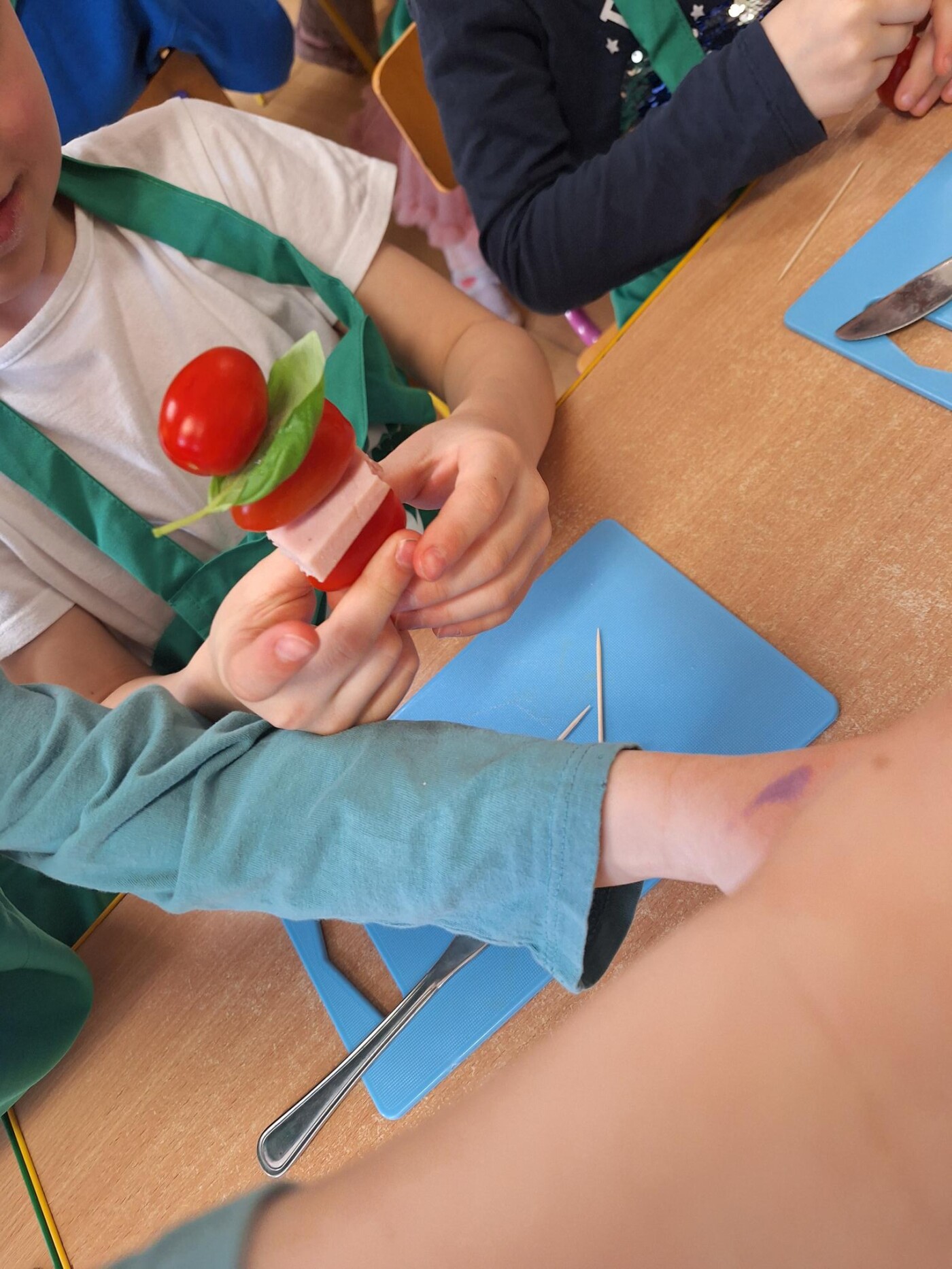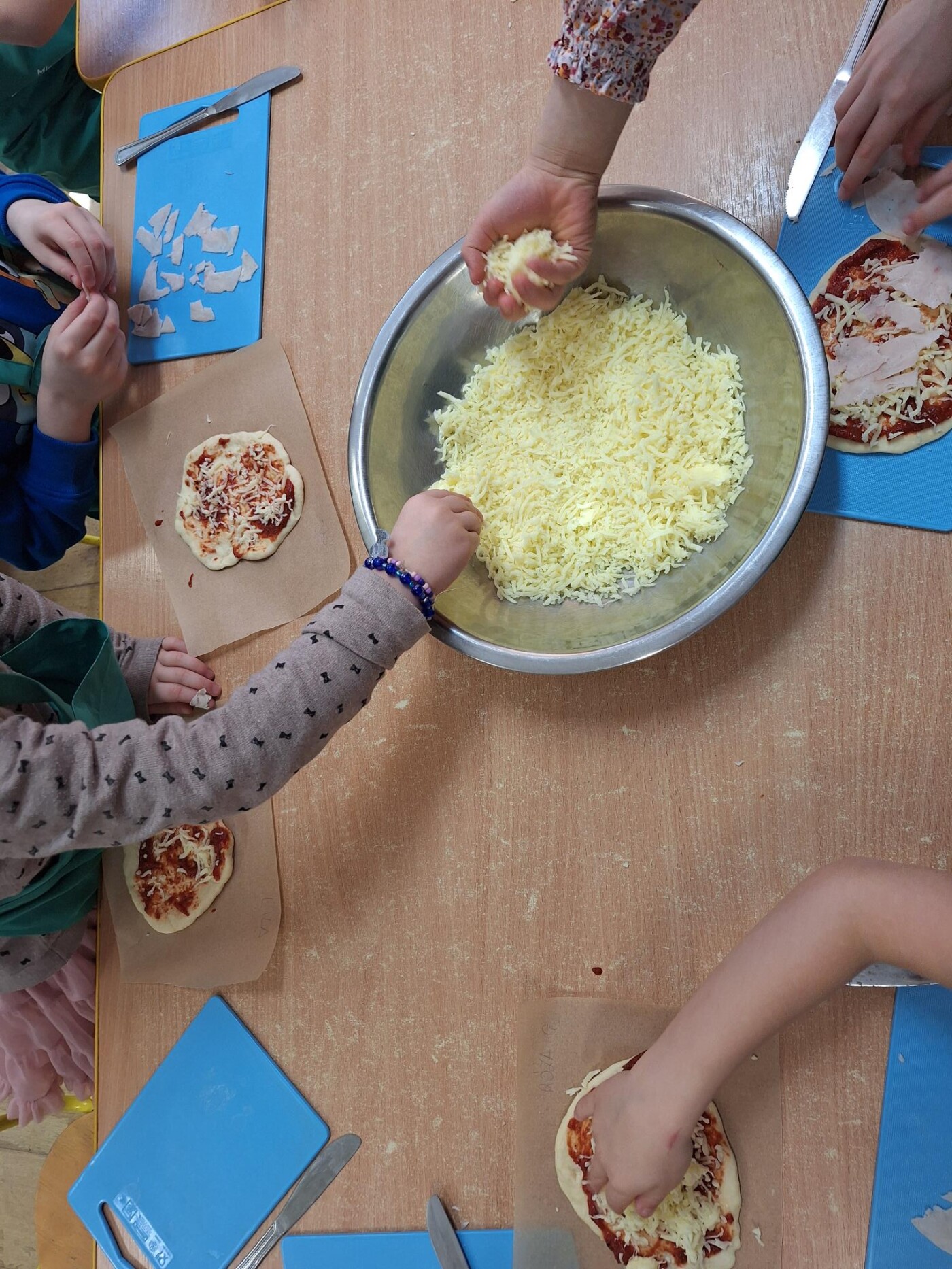 27 lutego w grupie IV „Mrówki” odbyły się kolejne zajęcia kulinarne z cyklu „Wiem, co jem”, podczas których dzieci poznały produkty spożywcze poprzez zmysł dotyku. Przedszkolaki miały okazję dotykać różnych składników i rozpoznawać ich fakturę oraz kształt. Następnie samodzielnie przygotowały pyszną pizzę, wybierając i układając ulubione dodatki. Dużo radości sprawiło im także wykonanie kolorowych koreczków. Zajęcia były nie tylko świetną zabawą, ale również okazją do rozwijania samodzielności u dzieci.