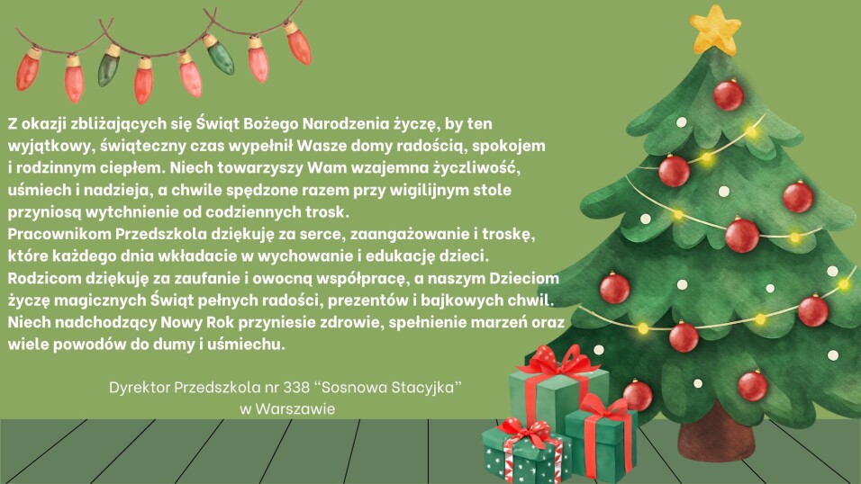 Rodzicom dziękuję za zaufanie i owocną współpracę, a naszym Dzieciom życzę magicznych Świąt pełnych radości, prezentów i bajkowych chwil.